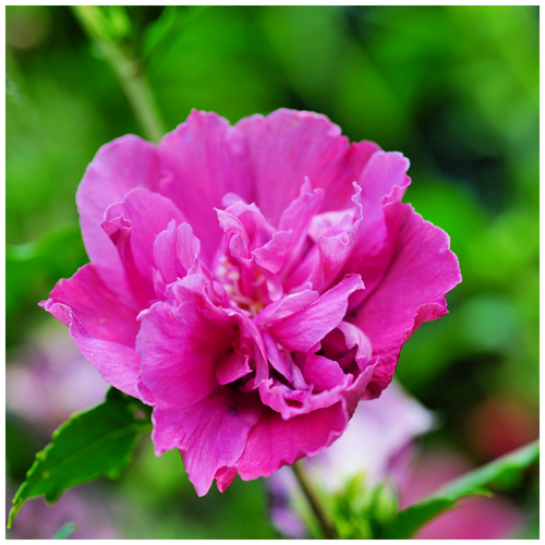 Hibiscus syriacus 'Collie Mullens' - Collie Mullens Rose of Sharon is a deciduous shrub that has deep pink, double flowers. They bloom over a long period in.