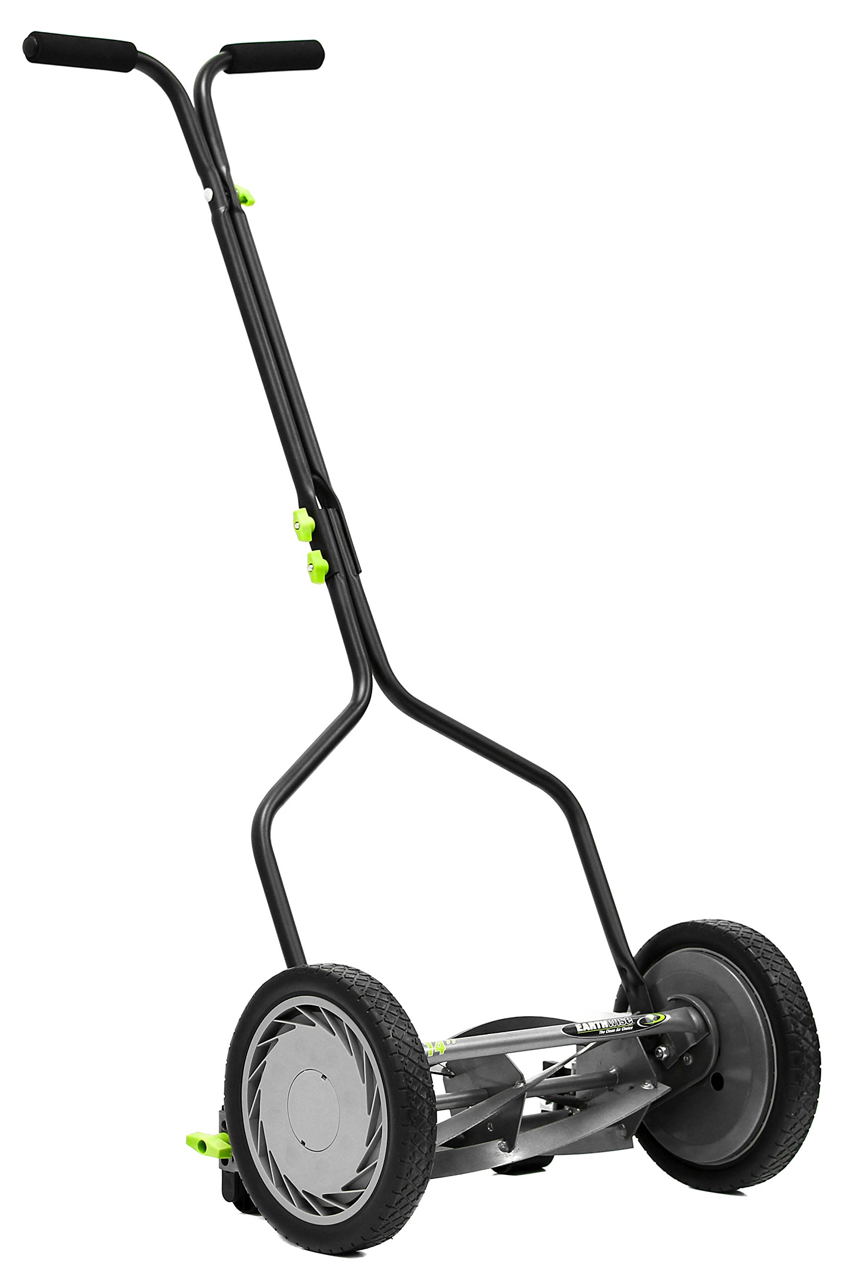 Earthwise 14" Push Reel Mower: 14" cutting width; 5-blade ball bearing reel; 10" composite wheels; Unbreakable steel sides; Adjustable cutting height of 1"-2.25" Clean, even cut every time; Blades made of heat-treated alloy steel for staying sharp longer; T-style handle with cushioned grip for comfort; Easy, tool-less assembly