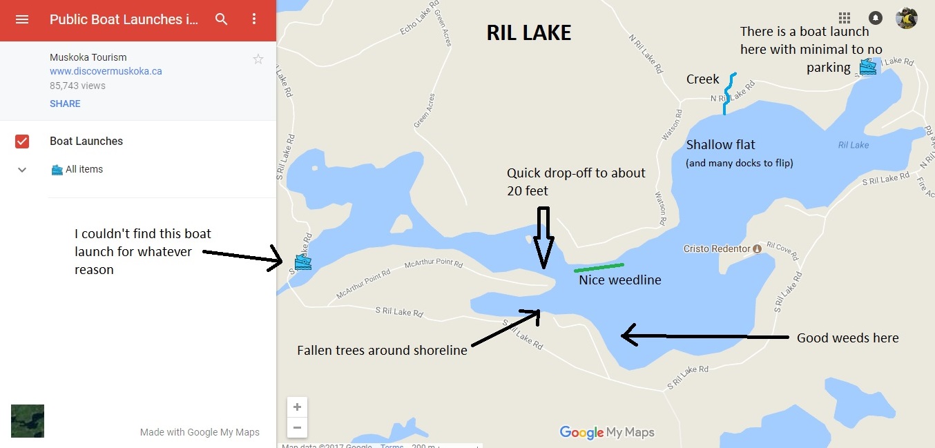 Ril Lake is in the Township of Lake of Bays, in the District of Muskoka. The perimeter of the lake is approximately 18.5 km with an average depth of 11ft. The lake is primarily spring fed and supplemented by creeks and seasonal run-off.